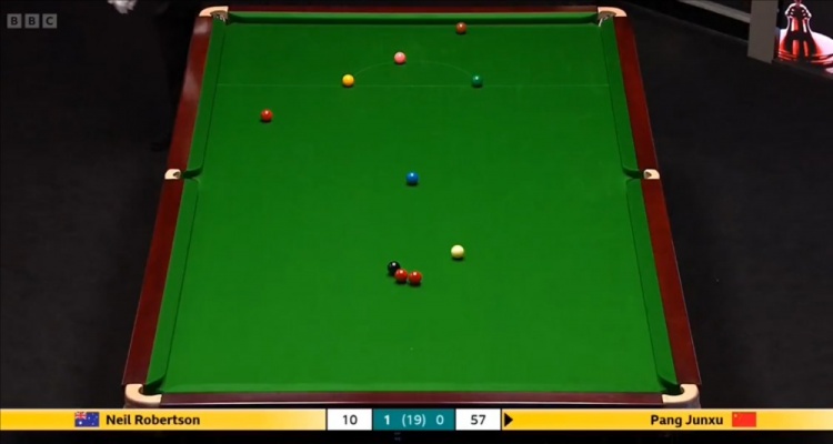 当时第二局的比分是10-57,尼尔·罗伯逊落后47分,他在用架杆打丢了黑球并将红球漏给庞俊旭之后直接认输。但当时台面上仍有3颗红球,台面分数仍然有51分,只要庞俊旭进攻红球失误,尼尔·罗伯逊完成衔接特定彩球的清台就能够翻盘。