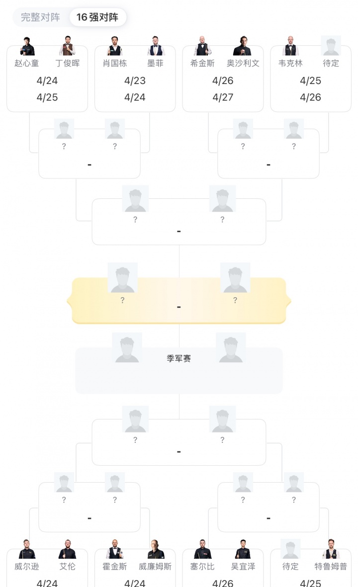 04月23日消息 2026斯诺克世锦赛第1轮,赵心童、肖国栋、丁俊晖、吴宜泽先后晋级16强,张安达、周跃龙、雷佩凡、范争一、贺国强先后出局。