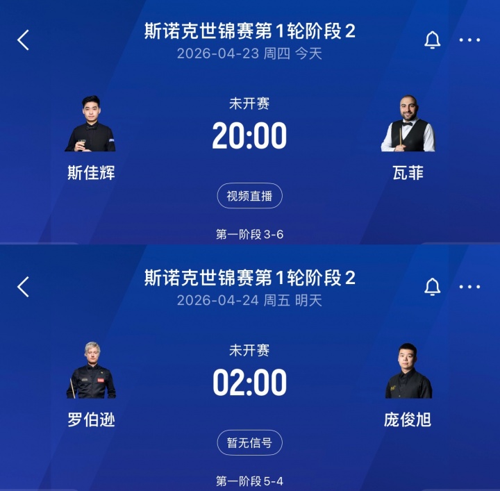 本届斯诺克世锦赛16强已定14席,首轮还剩最后2场对决,2场都有中国选手出战,斯佳辉第1阶段3-6落后侯赛因·瓦菲,庞俊旭第1阶段4-5落后尼尔·罗伯逊。两场比赛的第2阶段分别在23日20点和24日凌晨2点开打,明晨16强将全部确定。