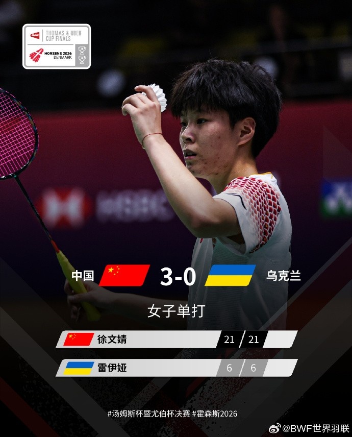 4月24日消息 2026年汤尤杯小组赛,尤伯杯国羽首战对阵乌克兰,徐文婧2-0(21-6、21-6)战胜雷伊娅,中国队大比分3-0领先乌克兰,已经提前锁定本场揭幕战胜利。根据小组赛规则,比赛将继续进行打满5场。