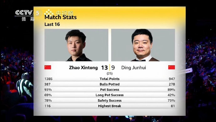 4月26日消息 斯诺克世锦赛第二轮,赵心童13-9丁俊晖,晋级八强。双方全场数据如下(赵心童在先)
