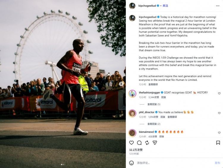 马拉松传奇选手基普乔格在社媒发文,向完成全马破2壮举的萨维和科杰尔查送上了祝贺。