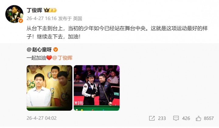 04月27日消息 斯诺克世锦赛16进8阶段,赵心童13-9淘汰丁俊晖,赛后赵心童晒出了自己儿时与丁俊晖的同框照,以及现今比赛时和丁俊晖的合照,并配文:一起加油❤️@丁俊晖 ,丁俊晖也转发了这条微博。