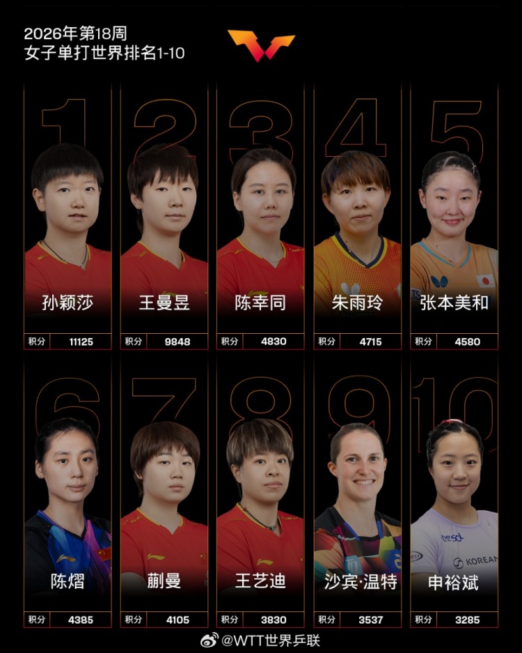 WTT世界排名:王楚钦领跑男单,孙颖莎王曼昱陈幸同包揽女单前三