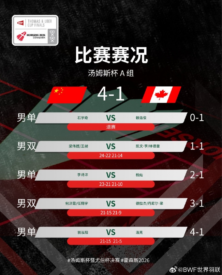 汤姆斯杯中国队4-1加拿大队提前晋级八强,石宇奇退赛