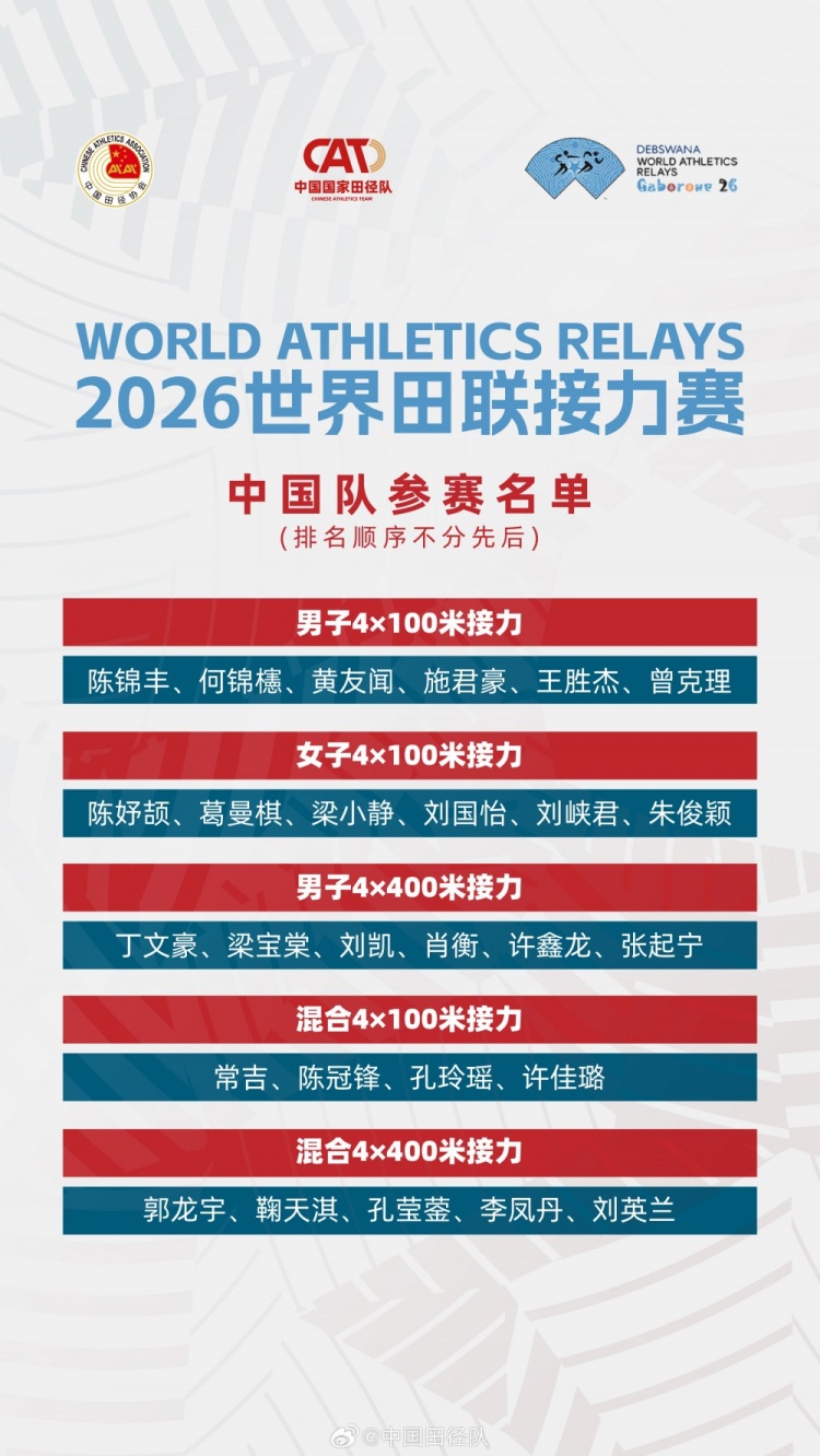 4月27日消息 2026年5月2日至3日,2026世界田联接力赛将于博茨瓦纳哈博罗内正式打响。中国田径队公布参赛名单与赛程。