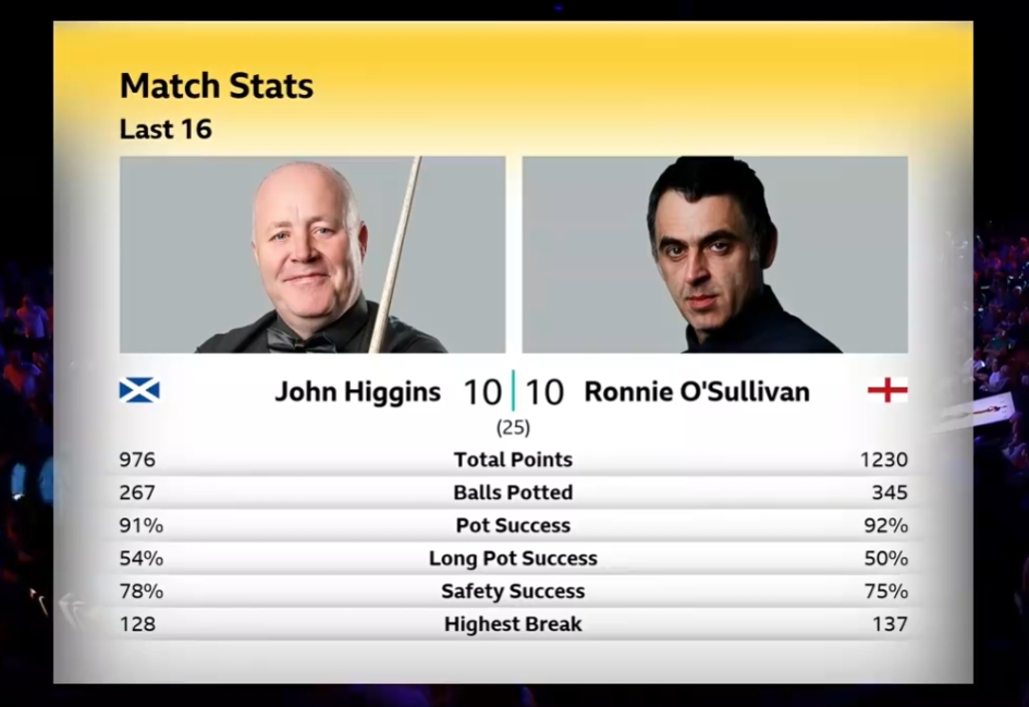 鏖战!第三阶段上半场希金斯3-1奥沙利文,大比分扳成10-10平!