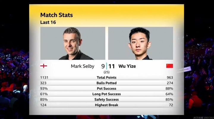 第三阶段上半场战罢,吴宜泽以11-9的比分暂时领先塞尔比。