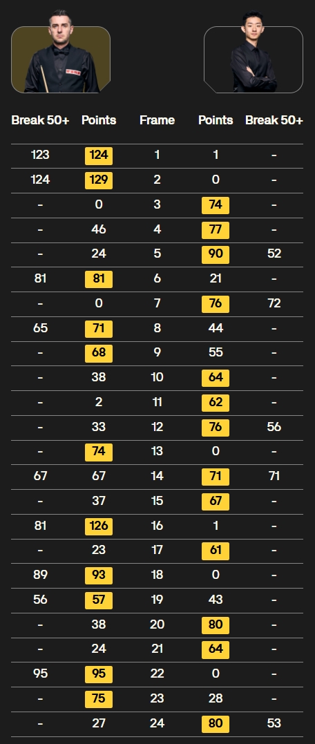 两人鏖战24局,其中吴宜泽单局最高90分,共打出五杆50+;塞尔比则打出两杆破百和七杆50+。