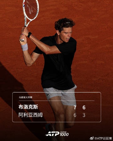 4月28日消息 马德里大师赛第三轮,布洛克斯2-0阿利亚西姆晋级。