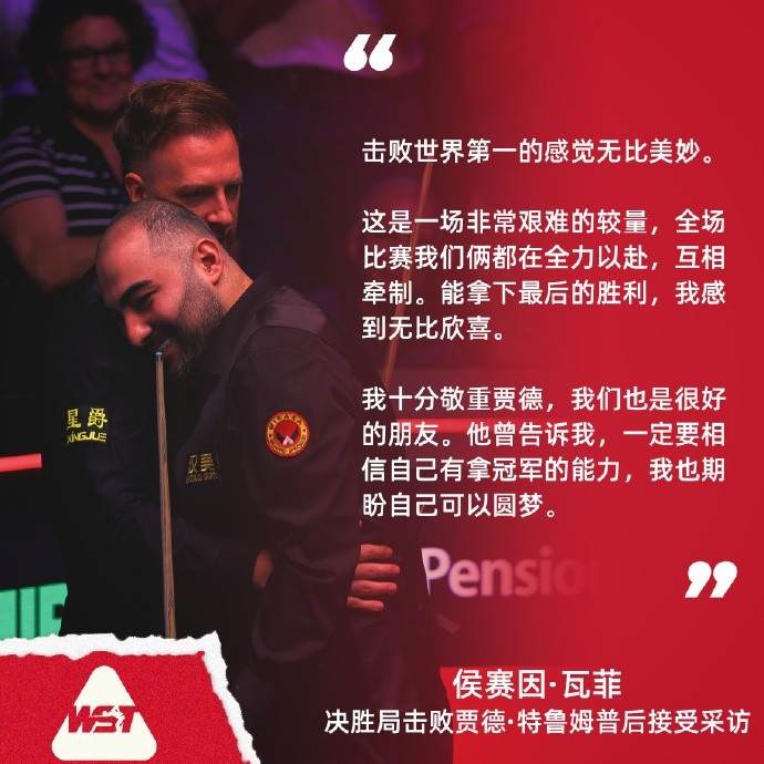 4月28日消息 斯诺克世锦赛16进8轮次,瓦菲13-12逆转特鲁姆普晋级8强,将战吴宜泽,他赛后接受采访时谈到了战胜特鲁姆普的感受。