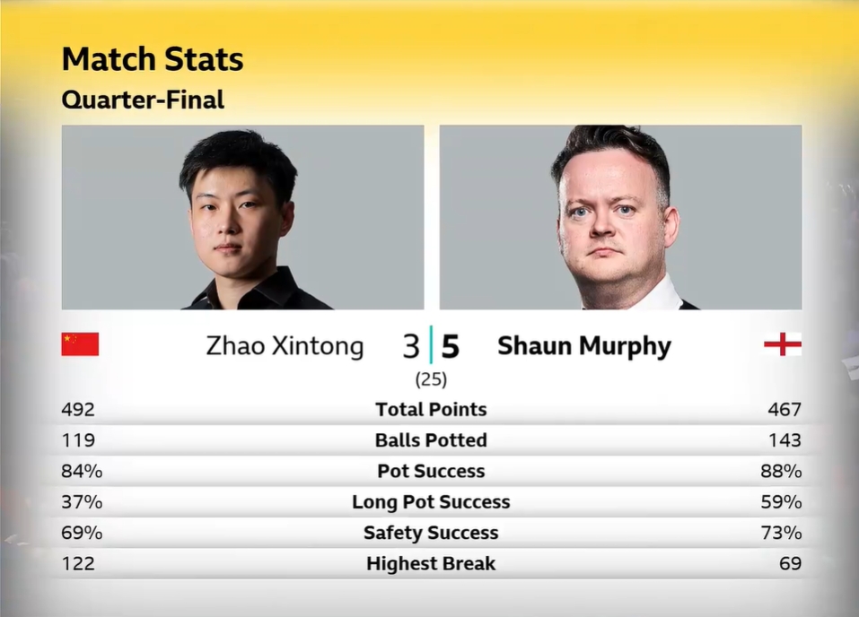 04月28日消息 2026斯诺克世锦赛1/4决赛,赵心童第一阶段3-5落后肖恩·墨菲,两人第一阶段数据对比如下。