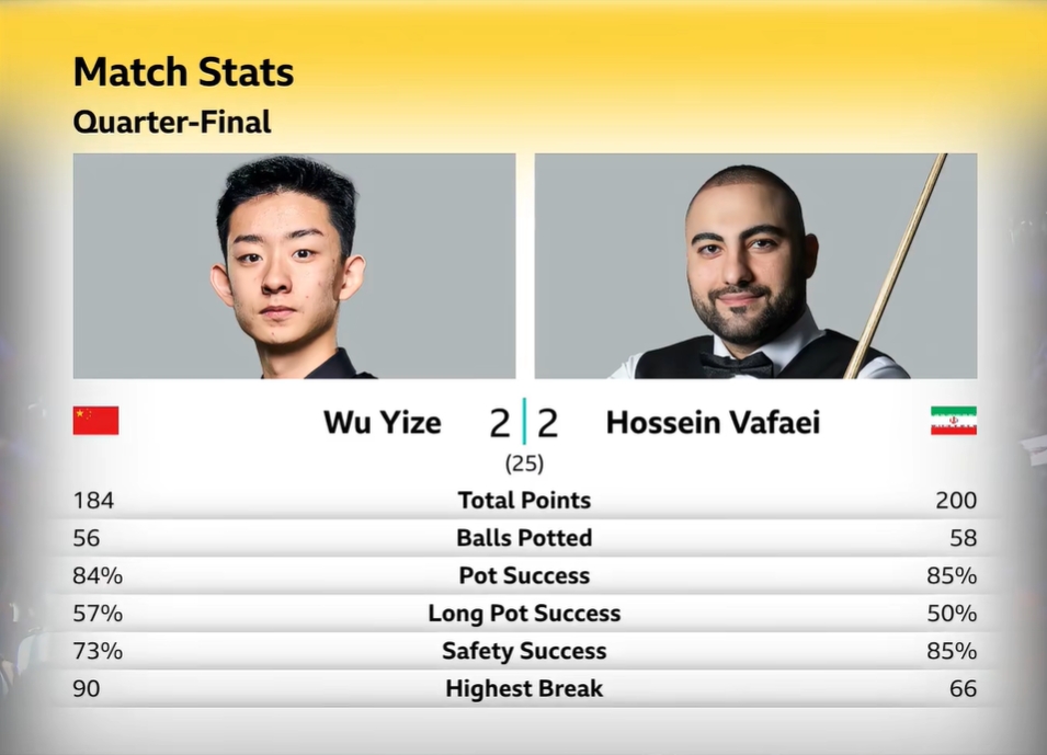 第一阶段上半场,侯赛因·瓦菲打出单杆66分,吴宜泽打出单杆90分,两人2-2战平进入中场休息。