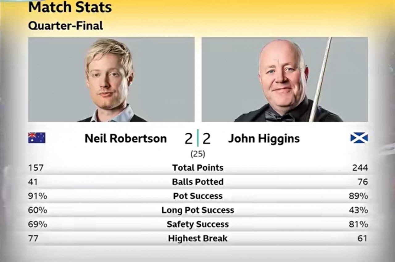 斯诺克世锦赛1/4决赛第一阶段上半场:希金斯2-2罗伯逊