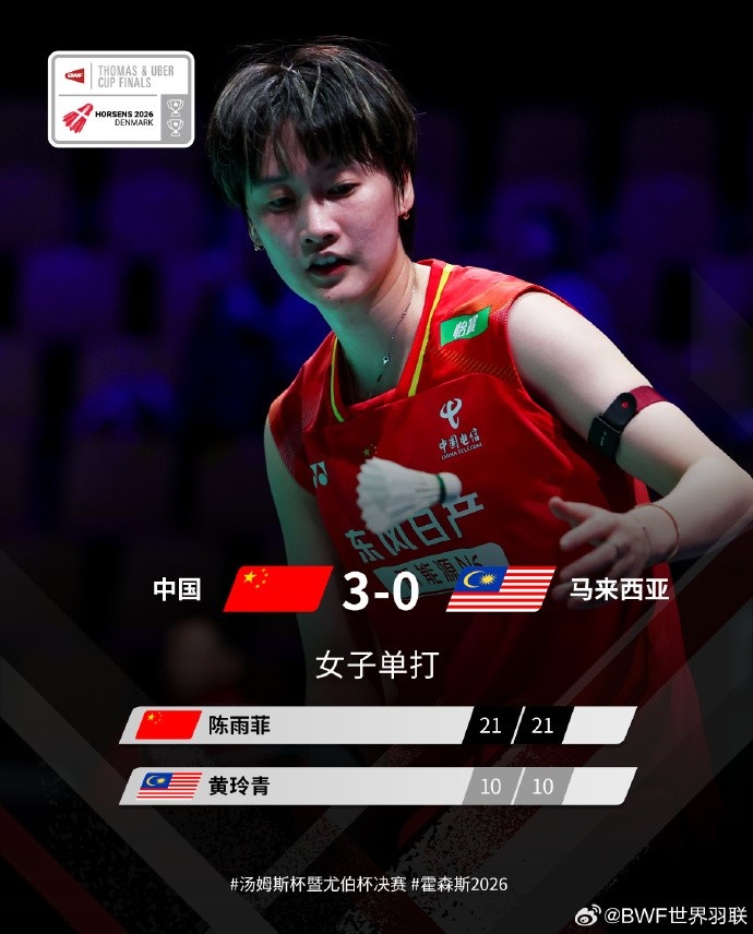 4月30日消息 北京时间今天下午进行的2026羽毛球尤伯杯1/4决赛,中国3-0马来西亚,晋级半决赛。